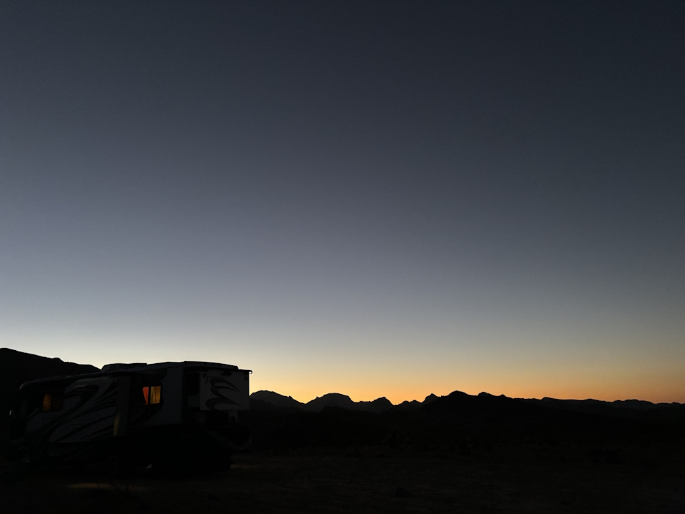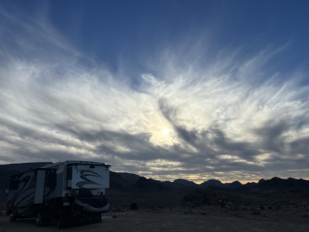 I found the dirt road, about 10 miles west of Bullhead and pulled in. After a deep breath and a prayer I pressed onward down the road. For about 2 miles, the road was just fine, it wasn’t until I came across a man working a backhoe fixing a section of it that I began to have my doubts. He was filling some pretty large dips in the road with gravel and gave me a little wave and smile as I soldiered on passed him. This was about the time I learned about a keyword or look for in dispersed camp site reviews: Washout. If you see the word washout, you probably don’t want to take your RV down that road.